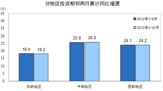 分地區(qū)看,1-10月份,東部地區(qū)投資137801億元,同比增長(zhǎng)18.2%,增速比1-9月份回落0.2個(gè)百分點(diǎn);中部地區(qū)投資81645億元,增長(zhǎng)26%,提高0.2個(gè)百分點(diǎn);西部地區(qū)投資70439億元,增長(zhǎng)24.2%,提高0.1個(gè)百分點(diǎn)。