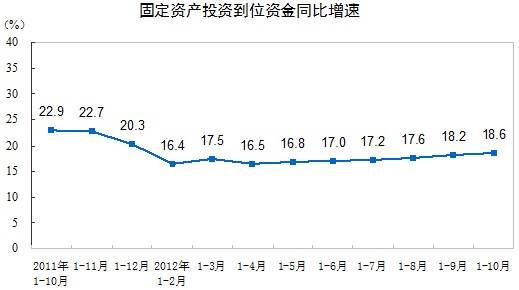 從到位資金情況看,1-10月份,到位資金325964億元,同比增長(zhǎng)18.6%,增速比1-9月份提高0.4個(gè)百分點(diǎn)。其中,國(guó)家預(yù)算資金增長(zhǎng)27.6%,增速提高0.2個(gè)百分點(diǎn);國(guó)內(nèi)貸款增長(zhǎng)9.3%,提高0.5個(gè)百分點(diǎn);自籌資金增長(zhǎng)22.1%,提高0.2個(gè)百分點(diǎn);利用外資下降10.1%,降幅比1-9月份擴(kuò)大3.8個(gè)百分點(diǎn);其他資金增長(zhǎng)11.8%,提高1.5個(gè)百分點(diǎn)。