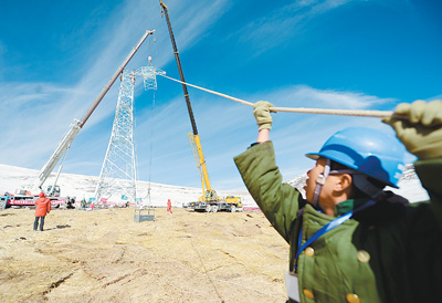 2012年11月6日11時45分,在海拔4915.7米的巴顏喀拉山口,5名高空作業(yè)人員通力協(xié)作,將玉樹電網(wǎng)與青海主網(wǎng)330千伏聯(lián)網(wǎng)工程第1237號鐵塔的最后一組塔材組裝完畢。至此,這座工程全線海拔最高的鐵塔巋然矗立,如同巨人一般遙望正南方向的玉樹地區(qū)。