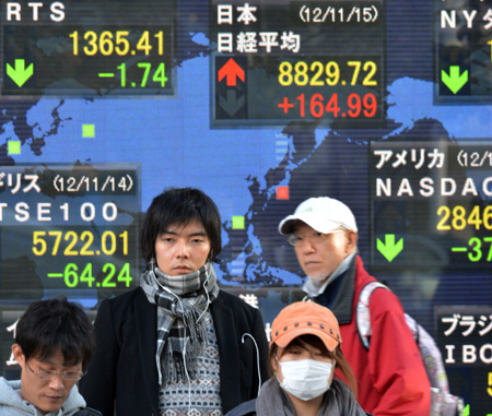 11月15日,東京股市高開高走,收盤時日經(jīng)225種股票平均價格指數(shù)比前一個交易日大漲1.90%,報8829.72點。日本首相野田佳彥14日宣布將于16日解散眾議院。若大選后誕生以自民黨為中心的新政權,預計新政府將采取激進的貨幣寬松政策及財政支出來刺激經(jīng)濟復蘇,受此提振,當日早盤日經(jīng)股指上漲0.96%! 圖為15日,在日本首都東京,行人經(jīng)過電子股指顯示牌。
