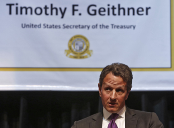 2008年全球金融危機(jī)爆發(fā)時(shí),蓋特納正擔(dān)任紐約聯(lián)邦儲(chǔ)備銀行主席。從那時(shí)起,直至奧巴馬就任總統(tǒng)后出任財(cái)長(zhǎng),蓋特納一直處于應(yīng)對(duì)金融危機(jī)的“第一線”,并成為奧巴馬經(jīng)濟(jì)刺激政策的主要執(zhí)行者。但正因如此,在金融救助計(jì)劃出現(xiàn)紕漏,經(jīng)濟(jì)復(fù)蘇形勢(shì)嚴(yán)峻,特別是失業(yè)率屢創(chuàng)新高的背景下,蓋特納總是充當(dāng)奧巴馬的“人肉盾牌”,替總統(tǒng)先生挨罵。