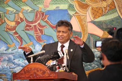 11月18日,在柬埔寨首都金邊,東盟秘書長素林在新聞發(fā)布會上講話。素林表示,盡管面臨諸多挑戰(zhàn),東盟領(lǐng)導(dǎo)人普遍認(rèn)為東盟一體化進(jìn)程進(jìn)展順暢,有信心在2015年建成東盟經(jīng)濟(jì)共同體。當(dāng)日,第21屆東盟峰會在柬埔寨首都金邊開幕。與會東盟領(lǐng)導(dǎo)人將重點(diǎn)討論深化區(qū)域合作、推進(jìn)區(qū)域一體化進(jìn)程、世界經(jīng)濟(jì)恢復(fù)乏力帶來的諸多全球性挑戰(zhàn)等重大問題。