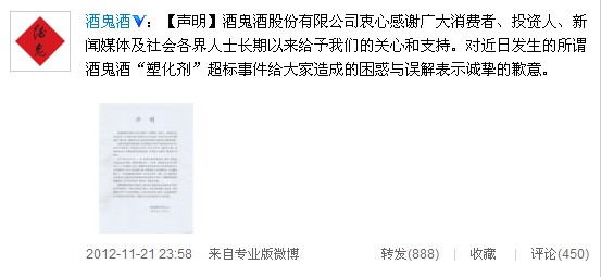 該聲明稱,公司50度酒鬼酒被檢測出DBP最高值1.04mg/kg的問題,經(jīng)過權(quán)威部門認(rèn)定,根據(jù)國際通用風(fēng)險(xiǎn)評估方法和歐洲食品安全局推薦的人體可以耐受攝入量,按照我國人均預(yù)期壽命,在適量的情況下,不會對健康造成損害,可以放心飲用。同時(shí),由于國際食品法典委員會、我國及其他地方均未制定酒類中鄰苯二甲酸酯類物質(zhì)的限量標(biāo)準(zhǔn),故不存在所謂“塑化劑”超標(biāo)的問題。