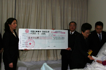 客戶尚先生于2008年10月在新華保險先后投保了福如東海A款終身壽險,附加提前給付重大疾病保險A款以及吉利相伴A款兩全保險。今年3月,尚先生被確診為結腸癌晚期,病情危重隨時危及生命。得知這一情況后,新華保險積極組織理賠工作,迅速啟動理賠綠色通道。3月23日晚,全國勞動模范、新華保險功勛總監(jiān)、海淀聯(lián)合營業(yè)區(qū)總經理金愛麗親自將提前給付的福如東海A款終身壽險,附加提前給付重大疾病保險A款100萬元大額理賠金送到正在接受治療的尚先生手中。
