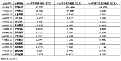 航運業(yè)低迷直觀反映在上市公司的業(yè)績上。Wind統(tǒng)計數(shù)據(jù)顯示,2012年三季度,按照申萬行業(yè)分類,14家航運類上市公司實現(xiàn)營業(yè)收入1032.8億元,同比上升5%;凈利潤則呈現(xiàn)全行業(yè)整體虧損局面,虧損總額達到了79.7億元,較去年同期的虧損57.3億元進一步擴大。14家上市航運企業(yè)中,前三季度凈利潤出現(xiàn)增長的僅有三家,中海海盛、中昌海運、寧波海運和中海發(fā)展的凈利潤跌幅分別達到了587.2%、407.0%、224.6%和149.8%。14家企業(yè)中,有9家前三季度出現(xiàn)了虧損,中國遠洋、*ST長油、長航鳳凰和中海發(fā)展分別虧損了64.0億元、9.4億元、6.3億元和4.1億元。