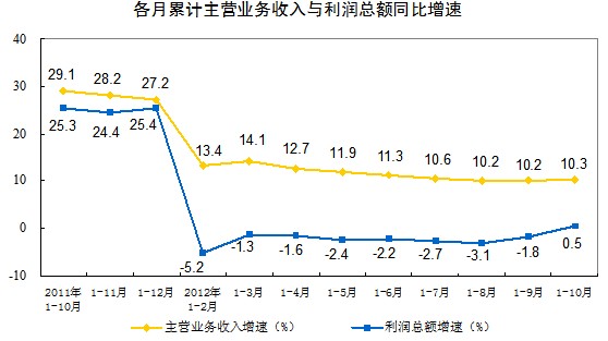 1-10月份,全國規(guī)模以上工業(yè)企業(yè)實現(xiàn)利潤40240億元,同比增長0.5%。10月當(dāng)月實現(xiàn)利潤5001億元,同比增長20.5%。