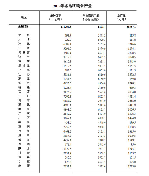 國家統(tǒng)計(jì)局關(guān)于2012年糧食產(chǎn)量數(shù)據(jù)的公告
