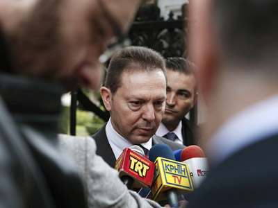 圖為希臘財政部長斯圖納拉斯當天在一次會議后接受采訪。