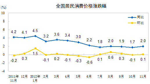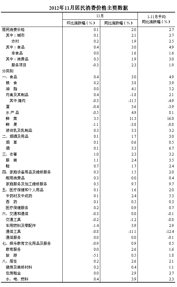 2012年11月份,全國(guó)居民消費(fèi)價(jià)格總水平同比上漲2.0%。其中,城市上漲2.1%,農(nóng)村上漲1.9%;食品價(jià)格上漲3.0%,非食品價(jià)格上漲1.6%;消費(fèi)品價(jià)格上漲1.9%,服務(wù)項(xiàng)目?jī)r(jià)格上漲2.3%。1-11月平均,全國(guó)居民消費(fèi)價(jià)格總水平比去年同期上漲2.7%。