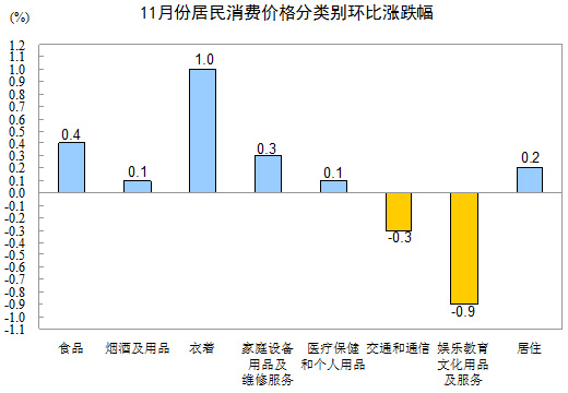 11月份,全國(guó)居民消費(fèi)價(jià)格總水平環(huán)比上漲0.1%。其中,城市上漲0.1%,農(nóng)村上漲0.2%;食品價(jià)格上漲0.4%,非食品價(jià)格持平;消費(fèi)品價(jià)格上漲0.3%,服務(wù)項(xiàng)目?jī)r(jià)格下降0.3%。