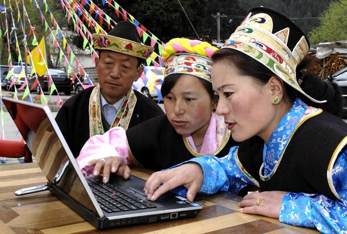 西藏林芝縣唐地村村民通過互聯(lián)網(wǎng)瀏覽新聞。 新華社 李偉明/攝 |