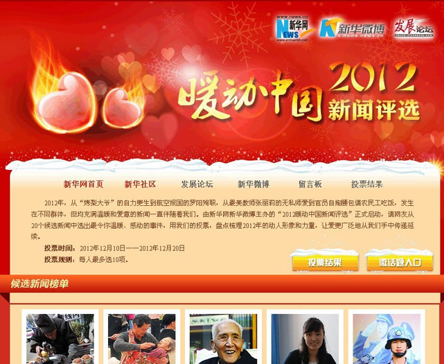 2012年,哪些新聞的出現(xiàn)讓你倍感溫暖?哪些新聞的“主角兒”讓你感動?由新華網(wǎng)新華微博主辦的“2012暖動中國新聞評選”已正式啟動,活動將根據(jù)網(wǎng)友投票從20個候選新聞中票選10個最令人“暖心”的事件。