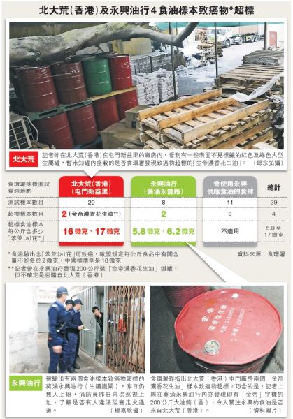 香港食環(huán)署上周到懷疑無牌食品加工場、糧油供貨商和13間食肆抽取39個樣本化驗,其中兩個來自屯門“北大荒”糧油供貨商的兩個“金帝濃香花生油”樣本,分別驗出含每公斤16和17微克“苯并(a)芘”,較國家標準每公斤10微克,多出6至7成;而現(xiàn)時歐盟標準為每公斤2微克,其樣本亦超出7至7.5倍。