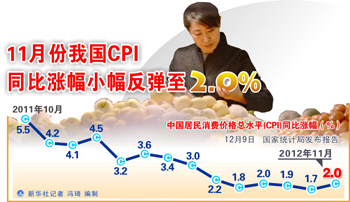從2011年8月開始的物價漲幅回落,很可能已于今年10月觸底,11月CPI重上2%,標(biāo)志著新一輪上漲階段的到來。國務(wù)院國資委研究中心研究員胡遲表示,盡管11月CPI的同比增幅只比10月擴(kuò)大了0.3個百分點,但這標(biāo)志著本輪物價的拐點已經(jīng)出現(xiàn),未來我國物價水平將進(jìn)入新一輪上升周期。