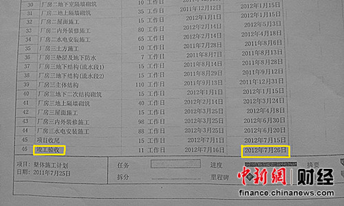 在康保中國(guó)向記者提供的《廠房一等四項(xiàng)工程整體施工進(jìn)度計(jì)劃》中可以看到,工程開(kāi)始時(shí)間為2011年7月28日,應(yīng)竣工時(shí)間為2012年7月26日。以2012年12月26日為節(jié)點(diǎn),工程已經(jīng)拖延5個(gè)月。