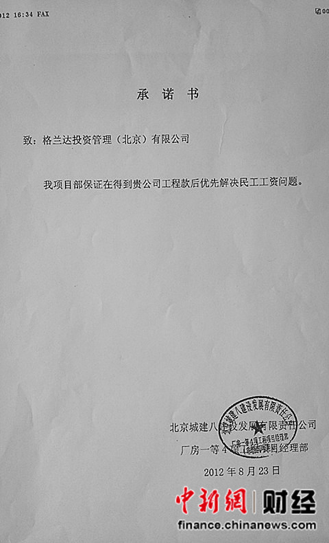 關(guān)于解決農(nóng)民工工資問題城建八致格蘭達(dá)承諾書