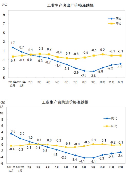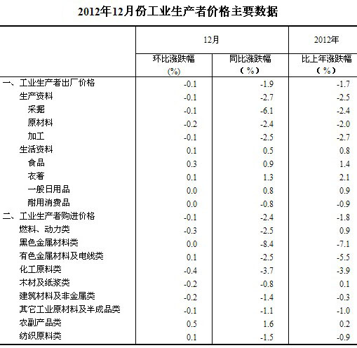 2012年12月份,全國工業(yè)生產(chǎn)者出廠價格同比下降1.9%,環(huán)比下降0.1%。工業(yè)生產(chǎn)者購進價格同比下降2.4%,環(huán)比下降0.1%。2012年,工業(yè)生產(chǎn)者出廠價格比上年下降1.7%,工業(yè)生產(chǎn)者購進價格比上年下降1.8%。
