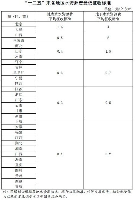 根據(jù)《通知》規(guī)定的“十二五”末各地區(qū)水資源費最低征收標(biāo)準(zhǔn),北京和天津的地表水水資源管理費平均征收標(biāo)準(zhǔn)為1.6元/立方米,地下水水資源費平均征收標(biāo)準(zhǔn)為4元/立方米,而上海和青海、西藏等省份同列最低費用征收標(biāo)準(zhǔn)范疇,地表水和地下水水資源費平均征收標(biāo)準(zhǔn)分別為0.1元/立方米和0.2元/立方米。