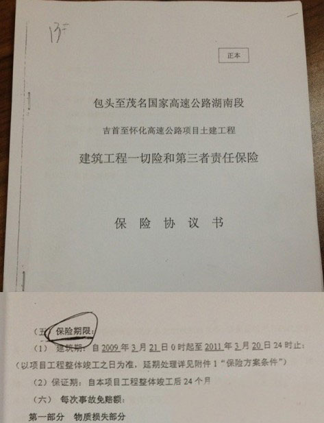 而雙方協(xié)議中規(guī)定的兩年保證期,被張曉萌忽略。他只告訴記者,湖南PICC參與了省內(nèi)大部分高速公路建筑工程項目一切險及第三者責(zé)任險的承保工作。
