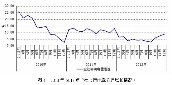 2012年,全社會用電量達(dá)4.96萬億千萬時(shí),同比增長5.5%,增速較上年回落6.51個(gè)百分點(diǎn)。全社會用電月度增速自3月開始波動下降,隨著國家宏觀調(diào)控作用顯現(xiàn)及受去年基數(shù)較低作用影響,10月開始用電增速逐月回升(圖1)。分季度看,一、二、三季度全社會用電量分別為11657、12095和13101億千瓦時(shí),同比分別增長6.8%、4.3%和3.9%,增速逐季回落,四季度全社會用電增速達(dá)7.45%,回升顯著。