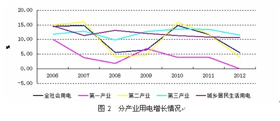 分產(chǎn)業(yè)看,2012年第一產(chǎn)業(yè)用電量1013億千瓦時(shí),與上年持平;第二產(chǎn)業(yè)用電量36669億千瓦時(shí),同比增長3.9%,增速較上年同期降低8.29個(gè)百分點(diǎn),占全社會用電量的比重也較上年同期下降1.10個(gè)百分點(diǎn)。第三產(chǎn)業(yè)和城鄉(xiāng)居民生活用電量分別為5690億千瓦時(shí)、6219億千瓦時(shí),同比分別增長11.5%和10.7%,均保持較快的增速,拉動全社會用電增長2.52個(gè)百分點(diǎn)(圖2)。