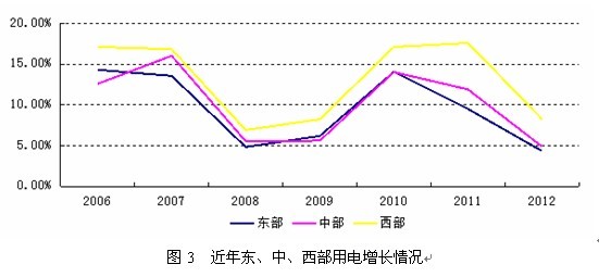 近年來西部地區(qū)用電增速持續(xù)高于東、中部地區(qū)(圖3)。2012年,東、中、西部地區(qū)用電增速分別為4.36%、4.92%和8.27%,西部地區(qū)增速分別高于東、中部地區(qū)3.91和3.36個(gè)百分點(diǎn),東、中、西部地區(qū)用電增速較上年同期分別下降5.16、7.00和9.34個(gè)百分點(diǎn)。