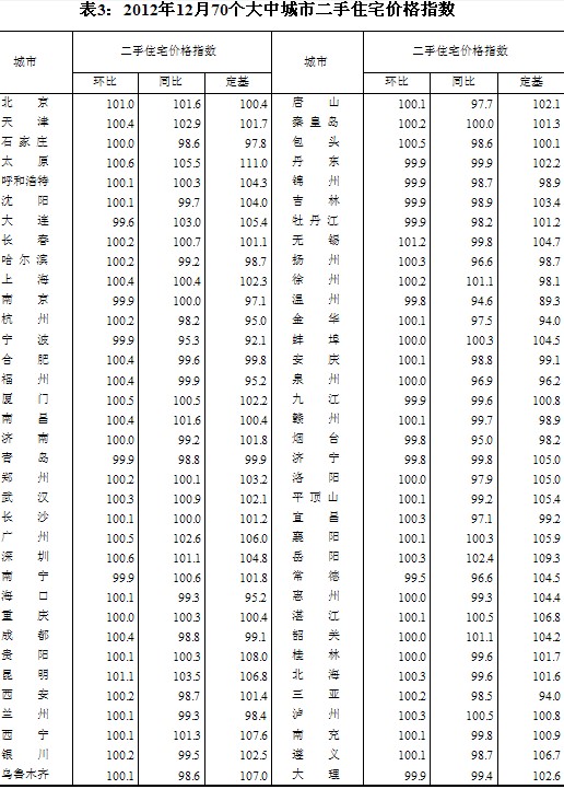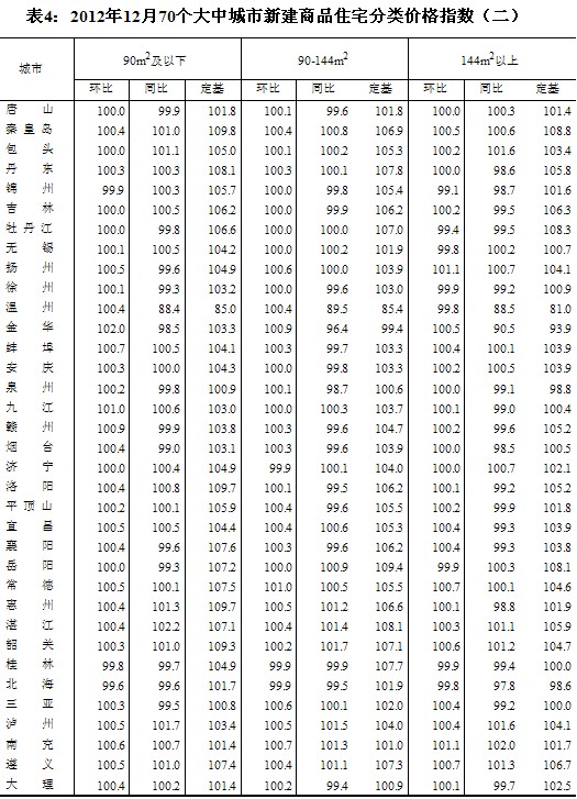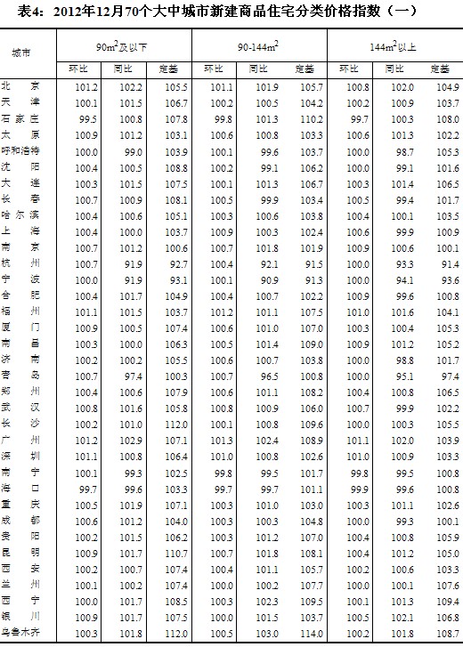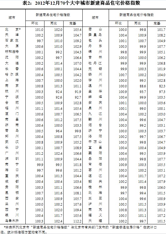 (二)與上年同月相比,70個(gè)大中城市中,價(jià)格下降的城市有26個(gè),持平的城市有4個(gè),上漲的城市有40個(gè)。12月份,同比價(jià)格上漲的城市中,漲幅均未超過(guò)2.4%,漲幅比11月份回落的城市有1個(gè)。