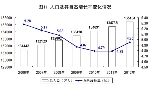 2012年末,中國大陸總?cè)丝?包括31個省、自治區(qū)、直轄市和中國人民解放軍現(xiàn)役軍人,不包括香港、澳門特別行政區(qū)和臺灣省以及海外華僑人數(shù))135404萬人,比上年末增加669萬人。出生人口1635萬人,人口出生率為12.10‰,比上年提高0.17個千分點;死亡人口966萬人,人口死亡率為7.15‰,比上年提高0.01個千分點;人口自然增長率為4.95‰,比上年提高0.16個千分點。從性別結構看,男性人口69395萬人,女性人口66009萬人;總?cè)丝谛詣e比為105.13(以女性為100,男性對女性的比例),比上年末下降0.05;出生人口性別比為117.70,比上年末下降0.08。從年齡構成看,60歲及以上人口19390萬人,占總?cè)丝诘?4.3%,比上年末提高0.59個百分點;65歲及以上人口12714萬人,占總?cè)丝诘?.4%,比上年末提高0.27個百分點;15-59歲勞動年齡人口93727萬人,比上年減少345萬人,占總?cè)丝诘谋戎貫?9.2%,比上年末下降0.60個百分點。從城鄉(xiāng)結構看,城鎮(zhèn)人口71182萬人,比上年末增加2103萬人;鄉(xiāng)村人口64222萬人,減少1434萬人;城鎮(zhèn)人口占總?cè)丝诒戎剡_到52.57%,比上年末提高1.30個百分點。全國居住地和戶口登記地不在同一個鄉(xiāng)鎮(zhèn)街道且離開戶口登記地半年以上的人口(即人戶分離人口)2.79億人,比上年末增加789萬人;其中流動人口為2.36億人,比上年末增加669萬人。年末全國就業(yè)人員76704萬人,比上年末增加284萬人;其中城鎮(zhèn)就業(yè)人員37102萬人,比上年末增加1188萬人。