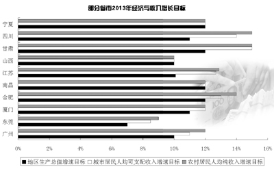 甘肅省提出2013年經(jīng)濟(jì)增長(zhǎng)12%以上,城鎮(zhèn)居民人均可支配收入和農(nóng)民人均純收入增長(zhǎng)15%,實(shí)際力爭(zhēng)發(fā)展得更快一些;四川省提出,努力實(shí)現(xiàn)2013年全省GDP增長(zhǎng)11%,奮斗目標(biāo)12%以上,城鎮(zhèn)居民可支配收入增長(zhǎng)14%,農(nóng)民人均純收入增長(zhǎng)15%;山西省提出的目標(biāo)是,地區(qū)生產(chǎn)總值增長(zhǎng)10%左右,城鎮(zhèn)居民人均可支配收入、農(nóng)民人均純收入分別增長(zhǎng)10%、10%以上。