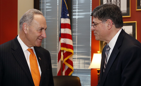 美國(guó)參議員、民主黨人舒默(左)22日在華盛頓國(guó)會(huì)山與獲得財(cái)長(zhǎng)提名的雅克布·盧會(huì)談,雙方就提高美國(guó)債務(wù)上限的相關(guān)問(wèn)題進(jìn)行了討論。當(dāng)日,美國(guó)白宮發(fā)言人卡尼表示,如果共和黨提出的公共債務(wù)上限短期調(diào)高方案能得到國(guó)會(huì)批準(zhǔn),美國(guó)總統(tǒng)奧巴馬會(huì)將其簽署成為法案。