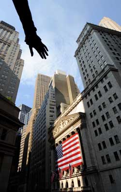 在美國(guó)紐約華爾街,華盛頓雕像的手臂指向晨光中的紐約證券交易所。記者 申宏