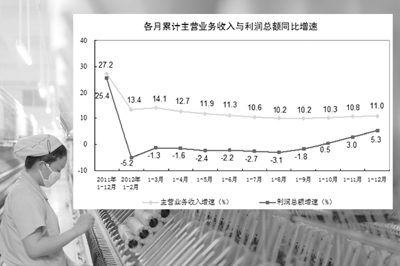 國家統(tǒng)計局27日發(fā)布,2012年全國規(guī)模以上工業(yè)企業(yè)實現(xiàn)利潤同比增長5.3%,12月當月增長17.3%。2011年12月全國規(guī)模以上工業(yè)企業(yè)實現(xiàn)利潤同比增長31.5%。經(jīng)濟學家分析認為,從2012年9月份開始,我國規(guī)模以上工業(yè)企業(yè)利潤連續(xù)4個月正增長,說明從短期看企業(yè)經(jīng)營情況在好轉(zhuǎn)。