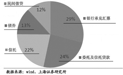 根據(jù)上海證券的測算,如果將影子銀行范圍界定為“除商業(yè)銀行表內信貸(本幣+外幣貸款)之外的所有融資方式”,主要包括銀行表外融資、非銀行間接融資、金融機構直接融資、非金融機構直接融資等幾大類,則估計我國影子銀行的規(guī)模約在27.88萬億元左右,占到2012年GDP比重的53.68%。方正證券則表示,從社會融資口徑進行估算(截至2012年12月):首先,考慮銀行表外業(yè)務,未貼現(xiàn)銀行承兌匯票約6.0萬億,委托貸款余額5.7萬億,信托貸款余額2.8萬億;其次,2012年三季度底信托資產余額為6.3萬億,年底或將達6.6萬億,民間借貸或在3.5萬億;另外,非銀行部門持有的企業(yè)債券余額約4萬億。據(jù)此估計影子銀行總量約28.6萬億元,約占GDP的55%。