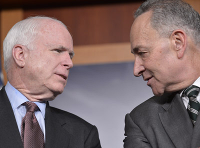 1月28日,在美國首都華盛頓國會山,民主黨參議員舒默(右)和共和黨參議員麥凱恩出席就移民改革框架方案舉行的記者會。
