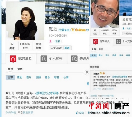 沉默了幾天的SOHO中國再次發(fā)出聲音。今天早上,SOHO中國CEO張欣在其實名微博稱,“指責我們串通洗錢和給巨額回扣都是造謠”。同時,該條微博中還提到了網(wǎng)友“財經(jīng)女記者部落”,張欣稱經(jīng)查詢“財經(jīng)女記者部落”與財經(jīng)雜志無關(guān),并大力支持反腐,“但如果以不法手段取得公司客戶信息,我們將報警公安!