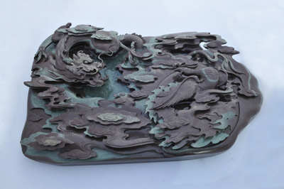本溪所產(chǎn)的遼硯,其特有的地質(zhì)地貌經(jīng)上億年演變,形成褐石紅和石青綠兩種奇石,即紫云石和青云石。青如碧而紫似檀,晶瑩明鑒,質(zhì)地細(xì)膩堅(jiān)韌,色澤明亮。用這種材質(zhì),由刀工純熟的匠師刻制的“百鳥(niǎo)朝鳳”、“游龍戲珠”、“雛燕凌空”等精美圖案的硯臺(tái),早年為清王朝御用之品,現(xiàn)已遠(yuǎn)銷(xiāo)日本、東南亞各國(guó)。2006年,遼硯(石雕)被列入遼寧省級(jí)“非物質(zhì)文化遺產(chǎn)”保護(hù)項(xiàng)目。