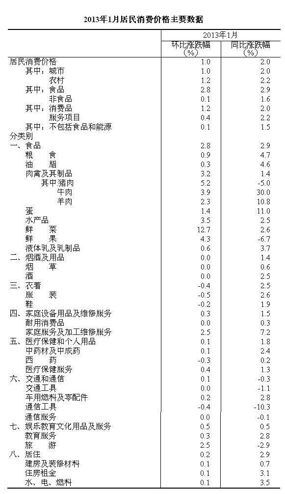 2013年1月份,全國居民消費價格總水平同比上漲2.0%。其中,城市上漲2.0%,農(nóng)村上漲2.2%;食品價格上漲2.9%,非食品價格上漲1.6%;消費品價格上漲2.0%,服務(wù)價格上漲2.2%。