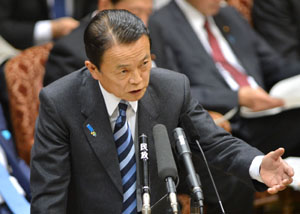 圖為19日麻生太郎在東京日本國(guó)會(huì)預(yù)算委員會(huì)會(huì)議上答問(wèn)。
