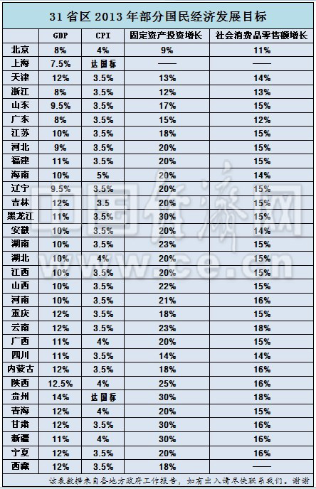 31省區(qū)現(xiàn)已全部公布了2013的地區(qū)生產(chǎn)總值增長目標。以高低順序排序:貴州位居第一(14%),陜西第二(12.5%),并列第三(12%)的有天津、吉林、重慶、云南、內(nèi)蒙古、青海、甘肅、寧夏、西藏這9個省區(qū),并列第四(11%)的有福建、黑龍江、廣西、四川、新疆這5個省區(qū),并列第五(10%)的有江蘇、海南、安徽、湖南、湖北、江西、山西、河南這8個省區(qū),并列第六(9.5%)的有山東、遼寧這2個省區(qū),位居第七的為河北(9%)、并列第八(8%)的為浙江、北京、廣東這3個省區(qū),上海以7.5%位于最后。