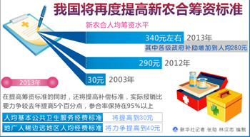 衛(wèi)生部部長陳竺在21日召開的全國基層衛(wèi)生與新農合工作會議上說,2013年新農合人均籌資水平提高到340元左右,參合率保持在95%以上,政策范圍內住院報銷比例達到75%,實際補償比力爭提高5個百分點,全國平均達到60%左右,縣鄉(xiāng)兩級實際住院補償比分別達到60%和75%等標準。此外,今年我國還將加快商業(yè)保險機構參與新農合經辦服務,開展利用人均15元左右的新農合基金購買大病保險試點。