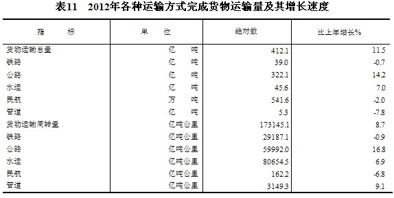 全年貨物運輸總量412億噸,比上年增長11.5%。貨物運輸周轉量173145億噸公里,增長8.7%。全年規(guī)模以上港口完成貨物吞吐量97.4億噸,比上年增長6.8%,其中外貿貨物吞吐量30.1億噸,增長8.8%。規(guī)模以上港口集裝箱吞吐量17651萬標準箱,增長8.1%。