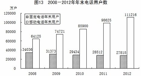 全年完成郵電業(yè)務總量[14]15022億元,比上年增長13.0%。其中,郵政業(yè)務總量2037億元,增長26.7%;電信業(yè)務總量12985億元,增長11.1%。郵政業(yè)全年完成郵政函件業(yè)務70.74億件,包裹業(yè)務0.69億件,快遞業(yè)務量56.85億件。電信業(yè)全年局用交換機容量新增478萬門,總容量43906萬門;新增移動電話交換機容量[15]11234萬戶,達到182870萬戶。年末固定電話用戶27815萬戶,其中,城市電話用戶18893萬戶,農村電話用戶8922萬戶。新增移動電話用戶12590萬戶,年末達到111216萬戶,其中3G移動電話用戶[16]23280萬戶。年末全國固定及移動電話用戶總數(shù)達到139031萬戶,比上年末增加11896萬戶。電話普及率達到103.2部/百人;ヂ(lián)網(wǎng)上網(wǎng)人數(shù)5.64億人,其中寬帶上網(wǎng)人數(shù)5.30億人;ヂ(lián)網(wǎng)普及率達到42.1%。