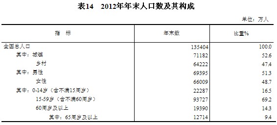年末全國(guó)大陸總?cè)丝跒?35404萬人,比上年末增加669萬人,其中城鎮(zhèn)人口為71182萬人,占總?cè)丝诒戎貫?2.6%,比上年末提高1.3個(gè)百分點(diǎn)。全年出生人口1635萬人,出生率為12.10‰;死亡人口966萬人,死亡率為7.15‰;自然增長(zhǎng)率為4.95‰。出生人口性別比為117.70。0-14歲(含不滿15周歲)人口22287萬人,占總?cè)丝诘?6.5%,比上年末提高0.01個(gè)百分點(diǎn);15-59歲(含不滿60周歲)勞動(dòng)年齡人口93727萬人,比上年末減少345萬人,占總?cè)丝诘?9.2%,比上年末下降0.60個(gè)百分點(diǎn);60周歲及以上人口19390萬人,占總?cè)丝诘?4.3%,比上年末提高0.59個(gè)百分點(diǎn)。全國(guó)人戶分離的人口[25]為2.79億人,其中流動(dòng)人口[26]為2.36億人。