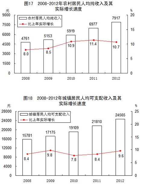 全年農(nóng)村居民人均純收入7917元,比上年增長(zhǎng)13.5%,扣除價(jià)格因素,實(shí)際增長(zhǎng)10.7%;農(nóng)村居民人均純收入中位數(shù)[27]為7019元,增長(zhǎng)13.3%。城鎮(zhèn)居民人均可支配收入24565元,比上年增長(zhǎng)12.6%,扣除價(jià)格因素,實(shí)際增長(zhǎng)9.6%;城鎮(zhèn)居民人均可支配收入中位數(shù)為21986元,增長(zhǎng)15.0%。農(nóng)村居民食品消費(fèi)支出占消費(fèi)總支出的比重為39.3%,城鎮(zhèn)為36.2%。