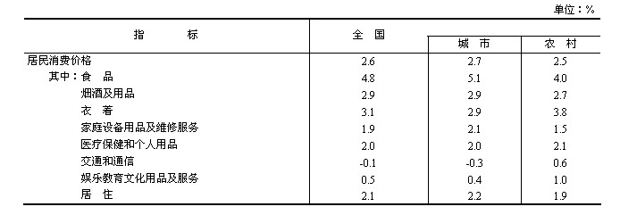 全年居民消費(fèi)價(jià)格比上年上漲2.6%,其中食品價(jià)格上漲4.8%。固定資產(chǎn)投資價(jià)格上漲1.1%。工業(yè)生產(chǎn)者出廠價(jià)格下降1.7%。工業(yè)生產(chǎn)者購(gòu)進(jìn)價(jià)格下降1.8%。農(nóng)產(chǎn)品生產(chǎn)者價(jià)格[3]上漲2.7%。