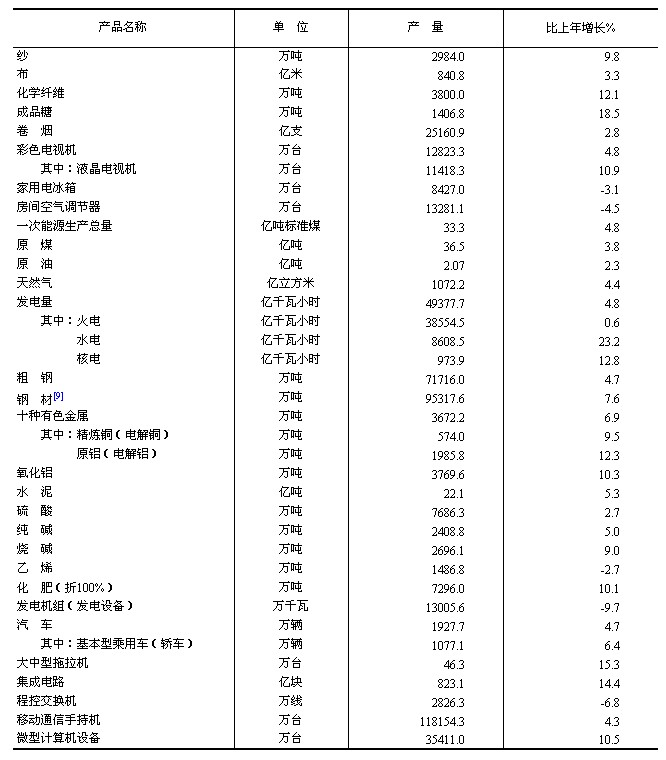 全年規(guī)模以上工業(yè)[7]中,農(nóng)副食品加工業(yè)增加值比上年增長(zhǎng)13.6%,紡織業(yè)增長(zhǎng)12.2%,通用設(shè)備制造業(yè)增長(zhǎng)8.4%,專用設(shè)備制造業(yè)增長(zhǎng)8.9%,汽車制造業(yè)增長(zhǎng)8.4%,計(jì)算機(jī)、通信和其他電子設(shè)備制造業(yè)增長(zhǎng)12.1%,電氣機(jī)械和器材制造業(yè)增長(zhǎng)9.7%。六大高耗能行業(yè)[8]增加值比上年增長(zhǎng)9.5%,其中,非金屬礦物制品業(yè)增長(zhǎng)11.2%,化學(xué)原料和化學(xué)制品制造業(yè)增長(zhǎng)11.7%,有色金屬冶煉和壓延加工業(yè)增長(zhǎng)13.2%,黑色金屬冶煉和壓延加工業(yè)增長(zhǎng)9.5%,電力、熱力生產(chǎn)和供應(yīng)業(yè)增長(zhǎng)5.0%,石油加工、煉焦和核燃料加工業(yè)增長(zhǎng)6.3%。高技術(shù)制造業(yè)增加值比上年增長(zhǎng)12.2%。