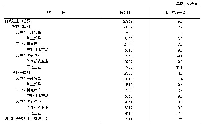 全年貨物進(jìn)出口總額38668億美元,比上年增長(zhǎng)6.2%。其中,出口20489億美元,增長(zhǎng)7.9%;進(jìn)口18178億美元,增長(zhǎng)4.3%。進(jìn)出口差額(出口減進(jìn)口)2311億美元,比上年增加762億美元。