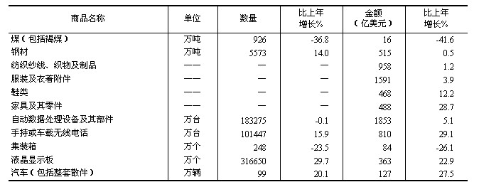 表7 2012年主要商品出口數(shù)量、金額及其增長(zhǎng)速度