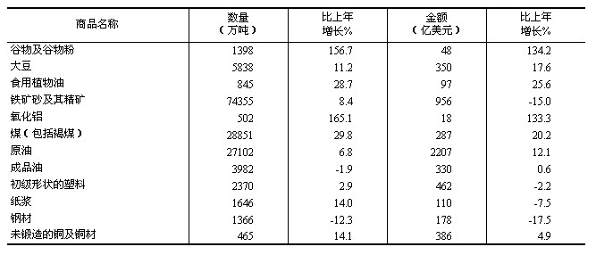 表8 2012年主要商品進(jìn)口數(shù)量、金額及其增長(zhǎng)速度