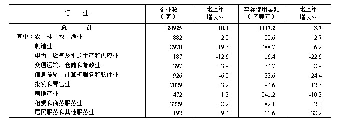 全年非金融領(lǐng)域新批外商直接投資企業(yè)24925家,比上年下降10.1%。實(shí)際使用外商直接投資金額1117億美元,下降3.7%。